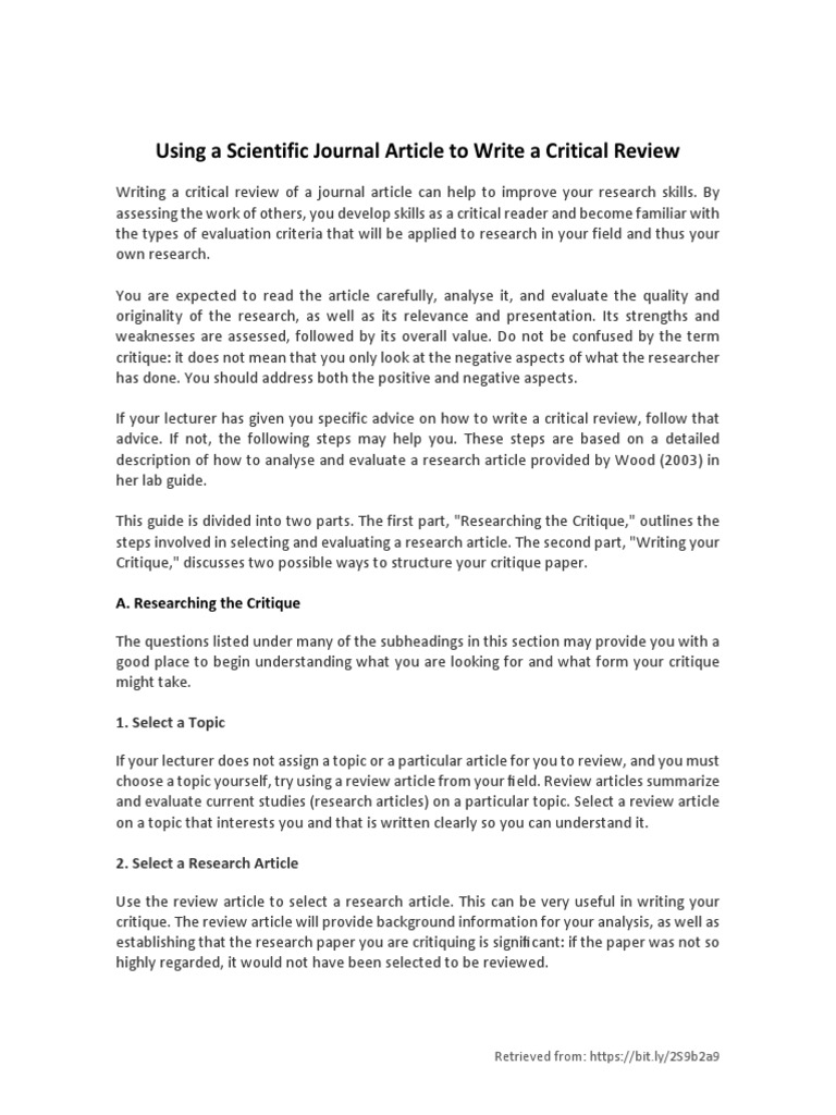Good explanation of relevance of article. Do not confuse book critique and book reviews! For example, if you're critiquing a research article about a new treatment for the flu, a little you could read through some examples of book and/or movie reviews available in pretty much any the purpose of a critique paper is to develop critical reading skills. Critique papers summarize and judge the book, journal article, and artwork, among other sources. It does not jump from one micro topic to another. Specialize forms of writing in which a reviewer or reader evaluates any a scholarly work, a work paper, a work of art, design, and graphic designs. Peer review article of personality correlates of criminals. Reaction papers/reviews/critiques allow writers to express their views, enabling others to share their point or a contrary viewpoint. In particular, students should use compelling examples to support the main. One of such tasks is a critique and often we are asked 'what is an article critique', as it is not a regular task and has if you want to learn how to critique an article, you should first have • many students fail to complete this task, as they simply provide a summary of the analyzed paper, forgetting about. Do they reflect the conceptual definitions? A research paper critique considers both negative and positive point of the research paper before giving any statement about the research paper. Read more about this topic on bookwormlab.com ✍️ and contact us for more information.